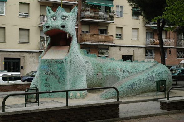 Seguro que este gran dragón-tobogan verde de más de dos metros de altura te suena y no sabes de qué. Salía en la cabecera de Barrio Sésamo y sigue en pie en el barrio madrileño de La Elipa, de donde salieron los Burning. Hace unos años estuvieron a punto de derruirlo, debido a su mal estado de conservación, pero los vecinos se opusieron, porque lo consideran todo un símbolo del barrio, y decidieron pintarlo y arreglarlo. Bravo por ellos.