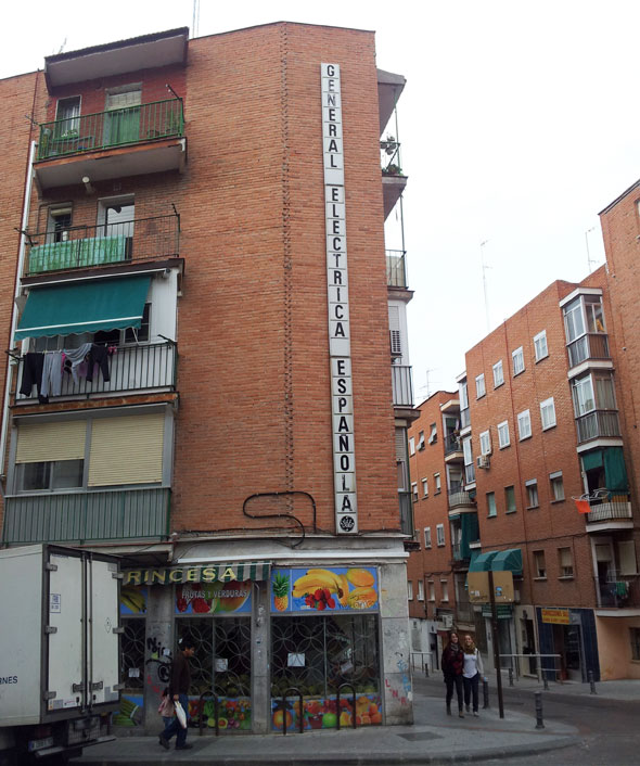 Nos vamos hasta el cruce de las calles Princesa y Cisneros de Alcorcón donde nos encontramos el rótulo más grande de todo nuestro Rotulandia. Un General Eléctrica Española recorre toda la fachada de arriba a abajo. Cuatro pisos de rótulo, casi nada.