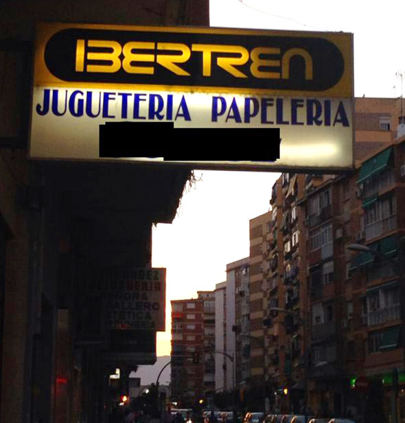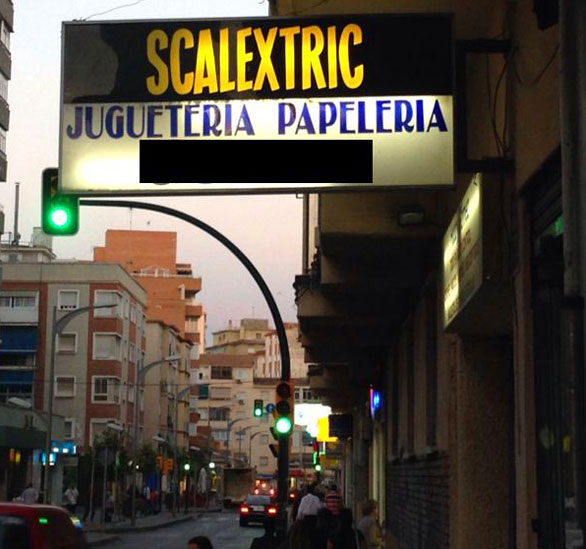 Aunque para joyas la del rótulo luminoso de esta juguetería papelería en la calle Unión de Málaga. Por un lado Ibertren y por el otro Scalextric, ¿podía ser más EGB?